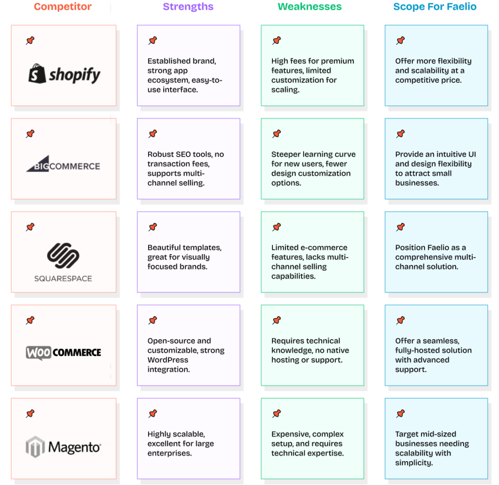 Understanding the competitive landscape is essential for positioning Faelio as a leading cloud-based, multi-channel e-commerce solution. By analyzing key competitors, I identified their strengths, weaknesses, and areas where Faelio can stand out. This ensures that our platform addresses market gaps and provides superior value to its target audience.