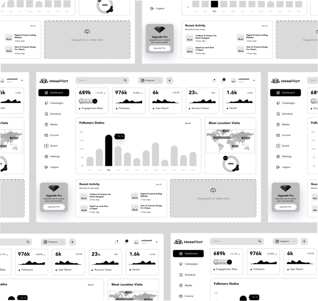 Before moving into high-fidelity designs, I crafted low-fidelity wireframes to establish the structure, navigation, and content hierarchy. The goal was to ensure a seamless flow for social media managers who need to manage multiple channels with ease.