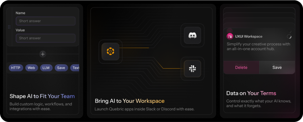 ✦ Features: Grid-based layout to explain Quebric core functions.
